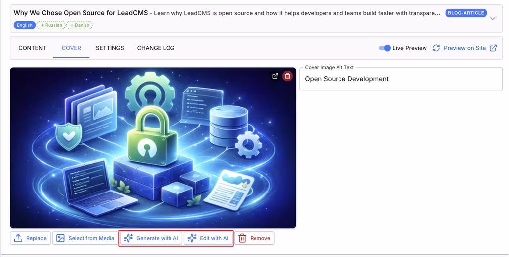 LeadCMS v1.3.17 is a major quality-of-life release for teams who publish frequently and care about consistency, performance, and smooth editorial workflows. This update makes AI content generation context-aware, introduces an end-to-end cover image workflow, removes previous media constraints with a full optimisation pipeline, and makes delivery simpler by letting editors deploy without touching CI/CD.